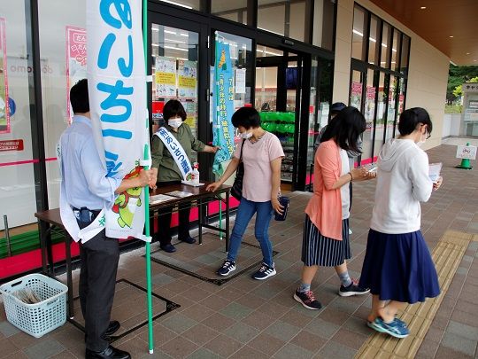 例年7月はさまざまな啓発活動を一斉に実施しており、今年は「青少年に有害な社会環境排除県民運動強化月間」「青少年の非行・被害防止全国強調月間」「社会を明るくする運動強調月間」「暴走族追放強化期間」「薬物乱用防止「ダメ。ゼッタイ。」普及運動」の5つについてチラシとポケットティッシュを配布しました。新型コロナウイルスの感染予防のため、啓発グッズは手渡しせず机に置いて、買い物客に声掛けをしました。