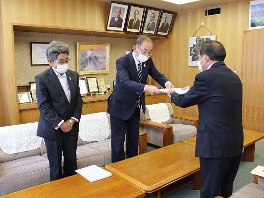 大町市特別職報酬等審議会(松田邦正会長)は、消防団の役員や団員の報酬額について、一部増額改定を行うことが適当とする答申書を10月12日に牛越市長に手渡しました。