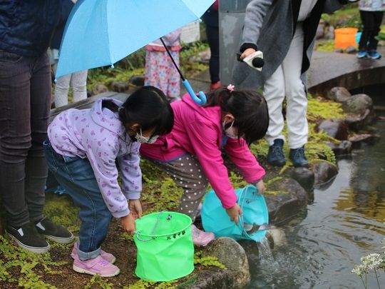 10月7日に下仲町ポケットパークで行われた魚の放流には、大町幼稚園の年長児15人が参加しました。あいにくの雨でしたが、園児たちは魚が入ったバケツを受け取ると、優しく水路に放流し、水路を泳ぐ魚の姿に見入っていました。