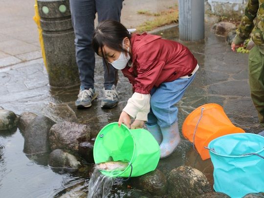 市は、持続可能な地域づくりを住民参加で考える「SDGsみずのわ月間」の一環で、大町の水の豊かさを感じてもらう機会を創出するための社会実験を行いました。市街地のポケットパーク内を流れる水路に淡水魚を放流し、まちなかの立ち寄りスポットとして演出する試みです。北安中部漁業協同組合の協力を得て、ニジマスやイワナなど計60匹を無償で提供いただき、実施しました。