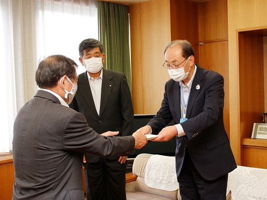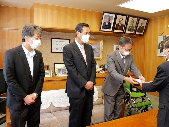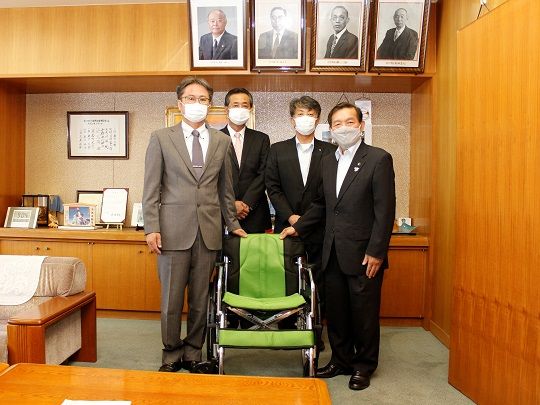 元々は5月に記念式典を行い、記念事業の一環として車いすの贈呈を予定していましたが、新型コロナウイルス感染症の影響により記念式典が中止となったことから、曽根原幹二会長ら3人が市役所を訪れ、牛越市長に車いす1台を渡しました。