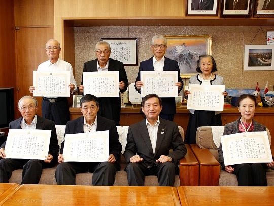 市は6月24日、今年3月末で退任した大町市交通指導員7人の活動をたたえ、牛越市長から感謝状を贈呈しました。