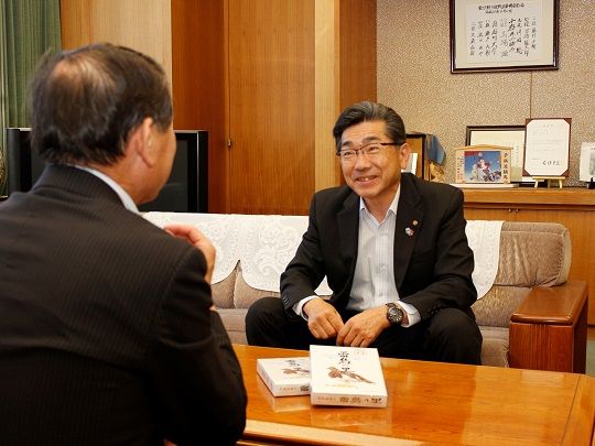「雷鳥の里」を製造・販売している雷鳥の里本舗 田中屋(曽根原光重社長)が6月8日、市役所を訪れ「雷鳥の里」を寄贈しました。