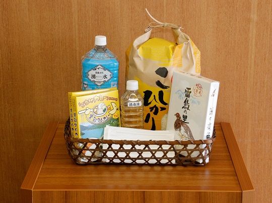 応援パックは、地元産のお米、信濃大町湧水、消毒液、マスク、特産品など、 5000円程度の内容です。事業所からの寄付や格安での提供により実現しました。