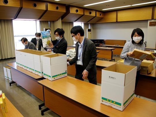 学生同士がSNSなどにより情報を拡散してくれた効果もあり、募集から3日間で申込件数が70件に到達、5月1日に第1便の梱包作業を行いました。