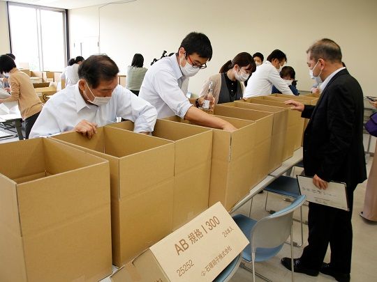 マスクは徐々に流通が回復しているもののまだ単価が高く、アルコールは品薄の状態が続いている中、少しでも施設の負担を減らすため実施しました。配布したマスク5,200枚は県からの提供と市の備蓄から、消毒用アルコール220本は市内酒類製造事業者から寄付していただいたものです。当日は市職員が梱包作業を行った後、市内24法人51事業所に運び入れました。