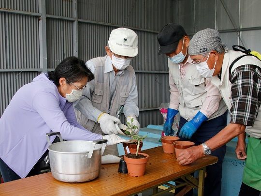 元々は4月29日の開講を予定していましたが、新型コロナウイルスの感染拡大防止のため延期、第2回の予定だったこの日を初回として今年度の講座がスタートしました。そのため、初回に行う予定だった芽挿しと培養土作りは、講師を務める「大町市秋香会」の皆さんが代わりに行いました。