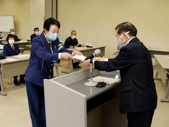 委嘱書を手渡した牛越市長は「交通指導員の皆さんのご尽力もあり、市内の交通死亡事故ゼロが675日続いている。交通事故は人が起こすものであり、一人一人に呼び掛ける地道な活動が事故減少につながる。引き続きお力添えをいただきたい」とあいさつしました。