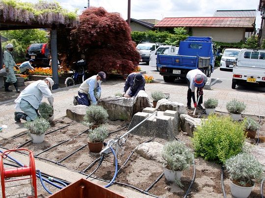 本来は、北アルプス国際芸術祭2020に合わせ、市民に広く参加を呼び掛ける予定でしたが、新型コロナウイルスの影響で芸術祭が延期、また人の密集を避けようと、花づくり活動に取り組む市民団体の皆さんと市職員が、少人数で行いました。
